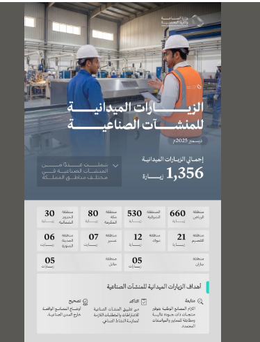 وصرح المتحدث الرسمي لوزارة الصناعة والثروة المعدنية جرّاح بن محمد الجرّاح، أن الزيارات الميدانية التي تمت خلال شهر ديسمبر 2025 تضمنت  660 زيارة للمصانع في منطقة الرياض، و530 زيارة في المنطقة الشرقية، و80 زيارة في منطقة مكة المكرمة، إضافةً إلى 30 زيارة في منطقة الحدود الشمالية، و21 زيارة في منطقة القصيم، و12 زيارة في منطقة تبوك، و7 زيارات في منطقة عسير، و6 زيارات في منطقة المدينة المنورة، و5 زيارات في كلٍ من منطقة جازان، ومنطقة حائل.