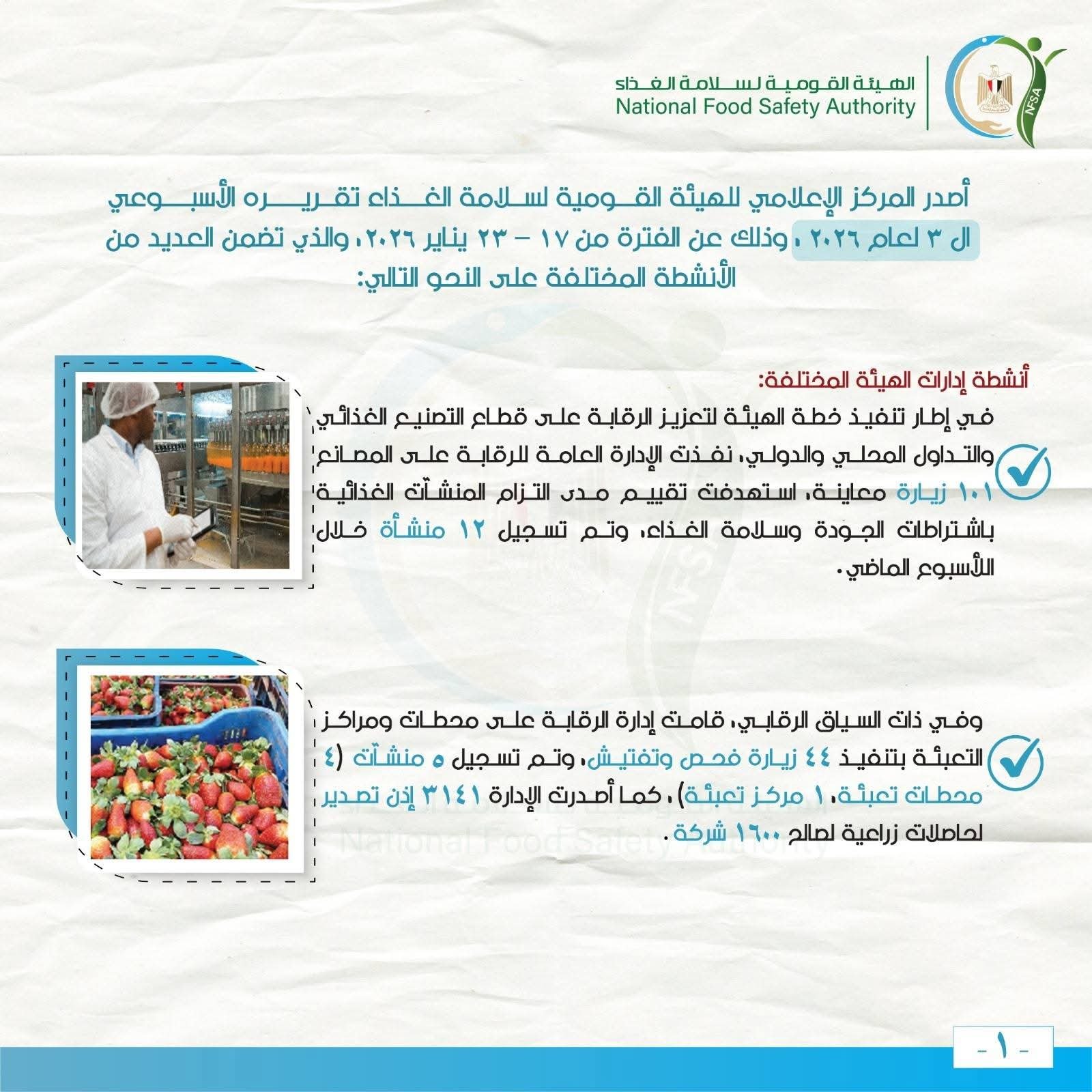 أصدر المركز الإعلامي للهيئة القومية لسلامة الغذاء تقريره الأسبوعي الثالث لعام 2026، وذلك عن الفترة من 17 – 23 يناير 2026، حيث نفذت الإدارة العامة للرقابة على المصانع 101 زيارة معاينة، استهدفت تقييم مدى التزام المنشآت الغذائية باشتراطات الجودة وسلامة الغذاء، وتم تسجيل 12 منشأة خلال اللأسبوع الماضي.