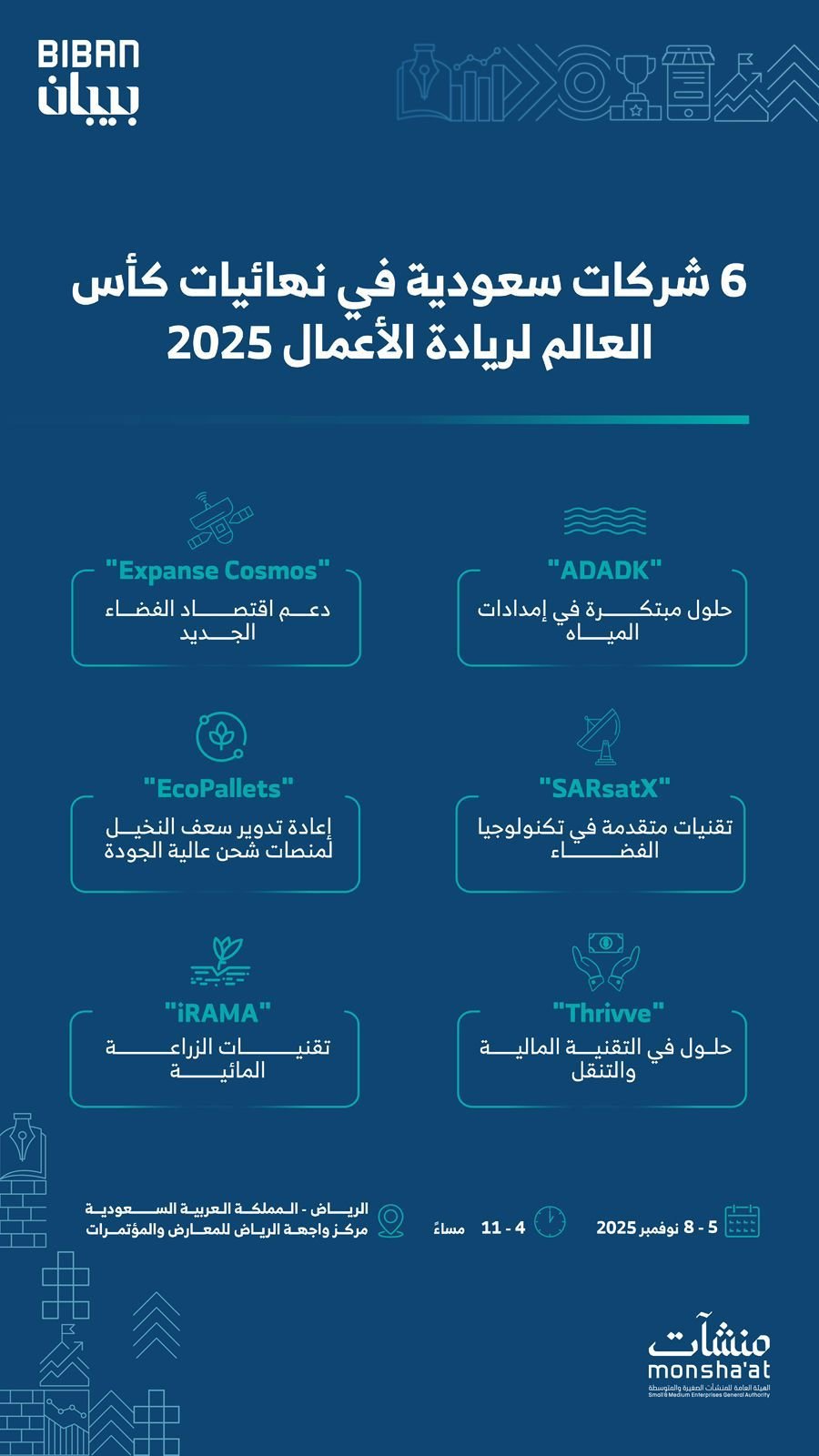 تأهلت ست شركات سعودية إلى نهائيات مسابقة كأس العالم لريادة الأعمال 2025، التي تستضيفها العاصمة الرياض، ضمن فعاليات ملتقى “بيبان 2025″، الذي تنظمه الهيئة العامة للمنشآت الصغيرة والمتوسطة “منشآت” خلال الفترة من 5 إلى 8 نوفمبر المقبل في مركز واجهة الرياض للمعارض والمؤتمرات، تحت شعار “وجهة عالمية للفرص”.وتمكنت الشركات السعودية من تجاوز مراحل التصفيات الوطنية والعالمية، لتتأهل ضمن أفضل (100) شركة من (47) دولة تتنافس في نهائيات مسابقة كأس العالم لريادة الأعمال، وذلك من بين أكثر من (10,300) متقدم يمثلون أكثر من (169) دولة حول العالم، للفوز بجوائز مالية تتجاوز قيمتها (1.5) مليون دولار أمريكي.ويعكس هذا الإنجاز دور المملكة الريادي في دعم الابتكار وريادة الأعمال على المستوى المحلي والعالمي، ويؤكد دورها بيئة استثمارية محفزة لريادة الأعمال، إذ تركز الشركات الست المتأهلة على تطوير حلول مبتكرة في مجالات متنوعة، مما يعزز القدرة التنافسية للشركات السعودية إقليميًا وعالميًا.وتشمل الشركات المتأهلة للنهائيات مجموعة من المشاريع والابتكارات التي تعكس التطور اللافت للشركات الناشئة بالمملكة، وهي: شركة “ADADK” الناشئة في مجال إمدادات المياه، وشركة ” Expanse Cosmos” المتخصصة في دعم اقتصاد الفضاء الجديد، وكذلك شركة “SARsatX” المتخصصة في مجال تكنولوجيا الفضاء، وشركة “EcoPallets” المتخصصة في إعادة تدوير سعف النخيل وتحويله إلى منصات شحن عالية الجودة، وشركة “Thrivve” المتخصصة في تقديم الحلول المبتكرة في مجالي التقنية المالية والتنقل، إضافة إلى شركة “iRAMA” المختصة بتقنيات الزراعة المائية.ويأتي تنظيم نهائيات مسابقة كأس العالم لريادة الأعمال ضمن “بيبان 2025″، ليؤكد دور المملكة الريادي في دعم الابتكار وريادة الأعمال عالميًا، ويعكس مكانتها المتقدمة في استقطاب الشركات الناشئة الدولية، والاستثمارات، والأفكار الريادية في بيئة اقتصادية تتوافق مع مستهدفات رؤية المملكة 2030 نحو بناء اقتصاد متنوع ومستدام.